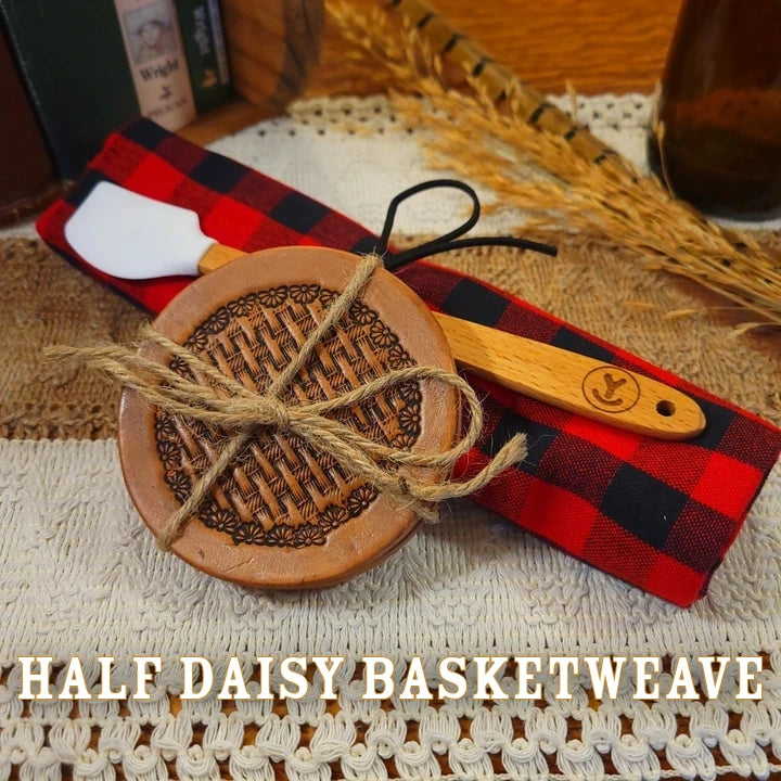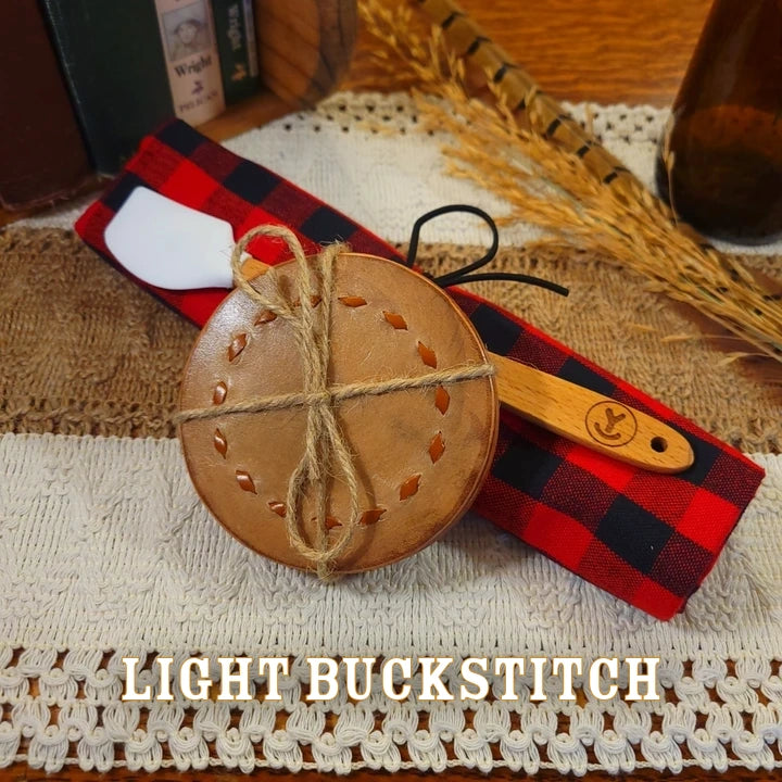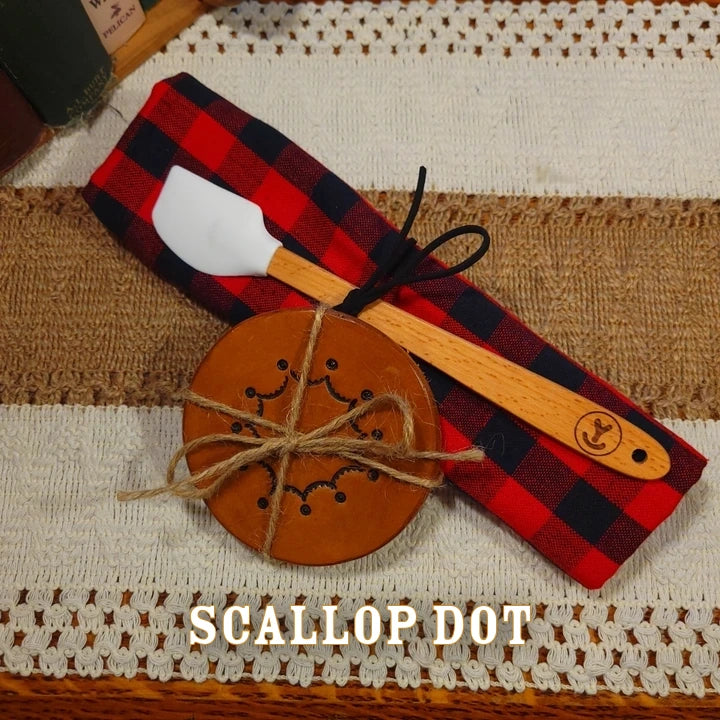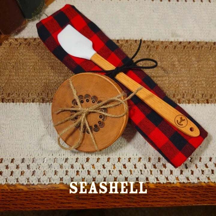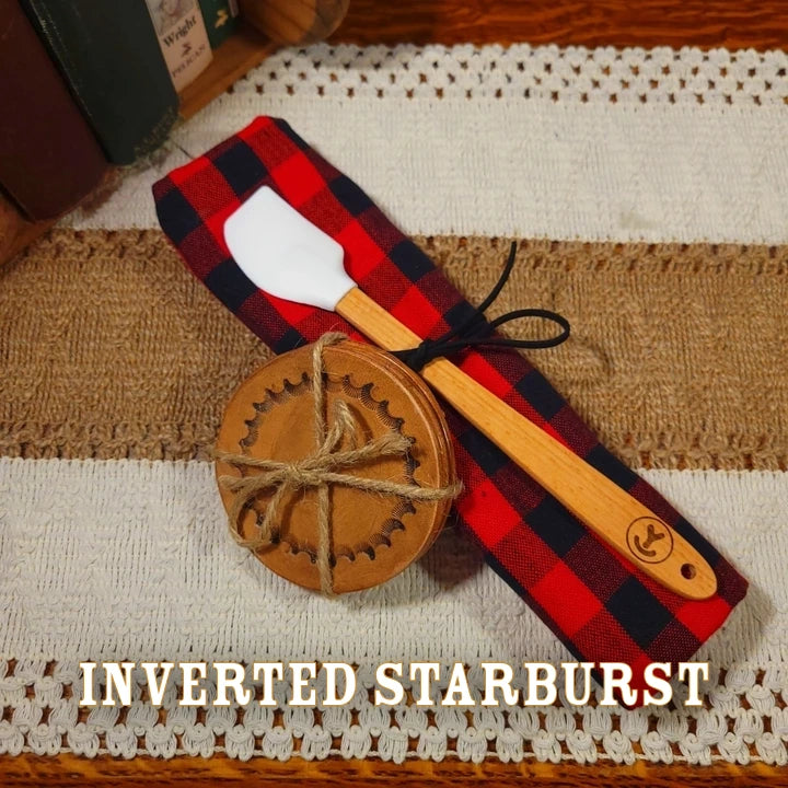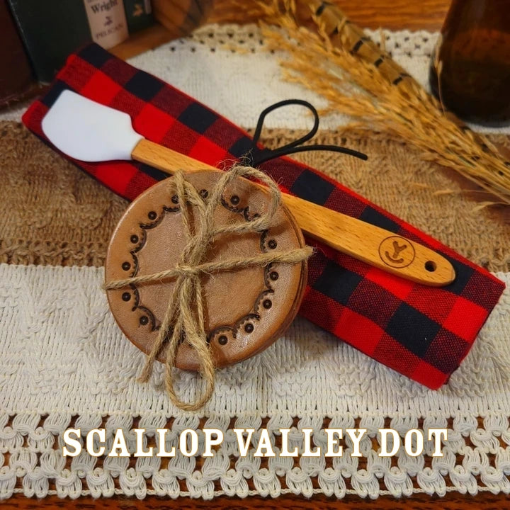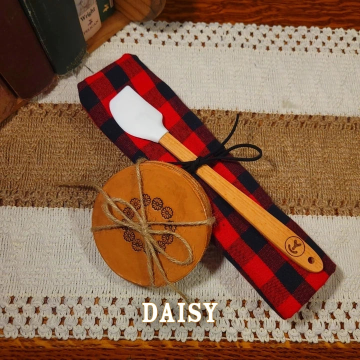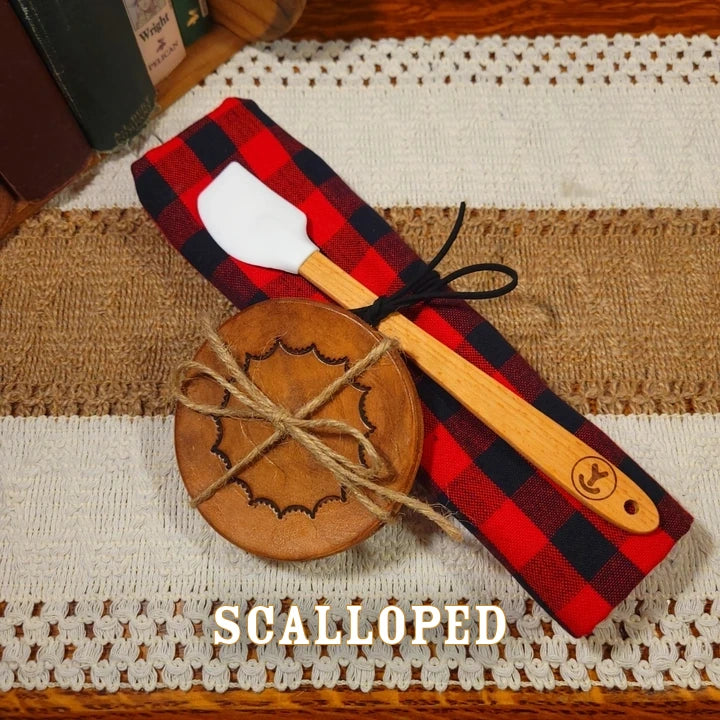 This set brings together the rustic feel of the West and the comfort of a well-made kitchen tool. Each package includes a hand-tooled leather coaster set, a red-and-black plaid towel, and a branded mini spatula — a simple gift that carries the look and feel of quality craftsmanship.