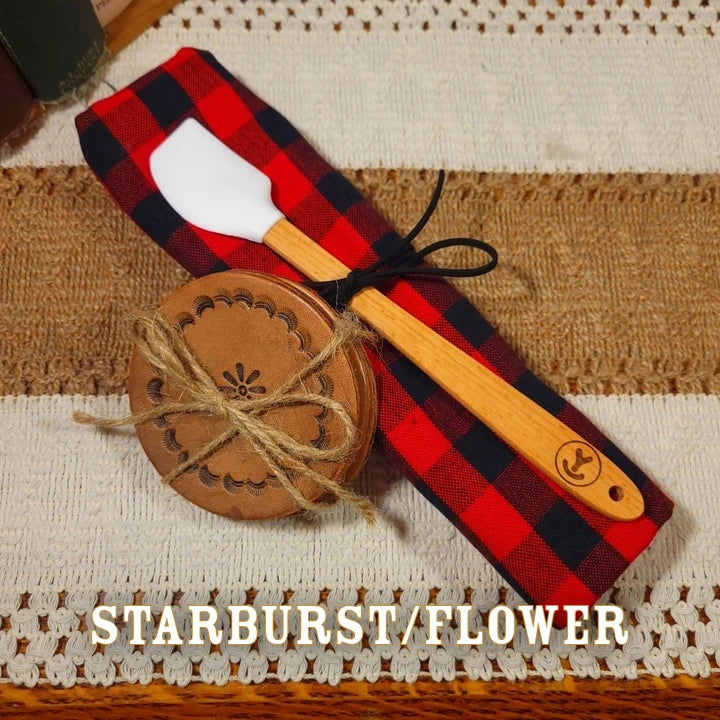 Every coaster is stamped and finished by hand in our shop, one piece at a time. The towel and spatula are made exclusively for this bundle and aren’t sold separately — created to round out a thoughtful, ready-to-gift package that fits any Western-inspired home.